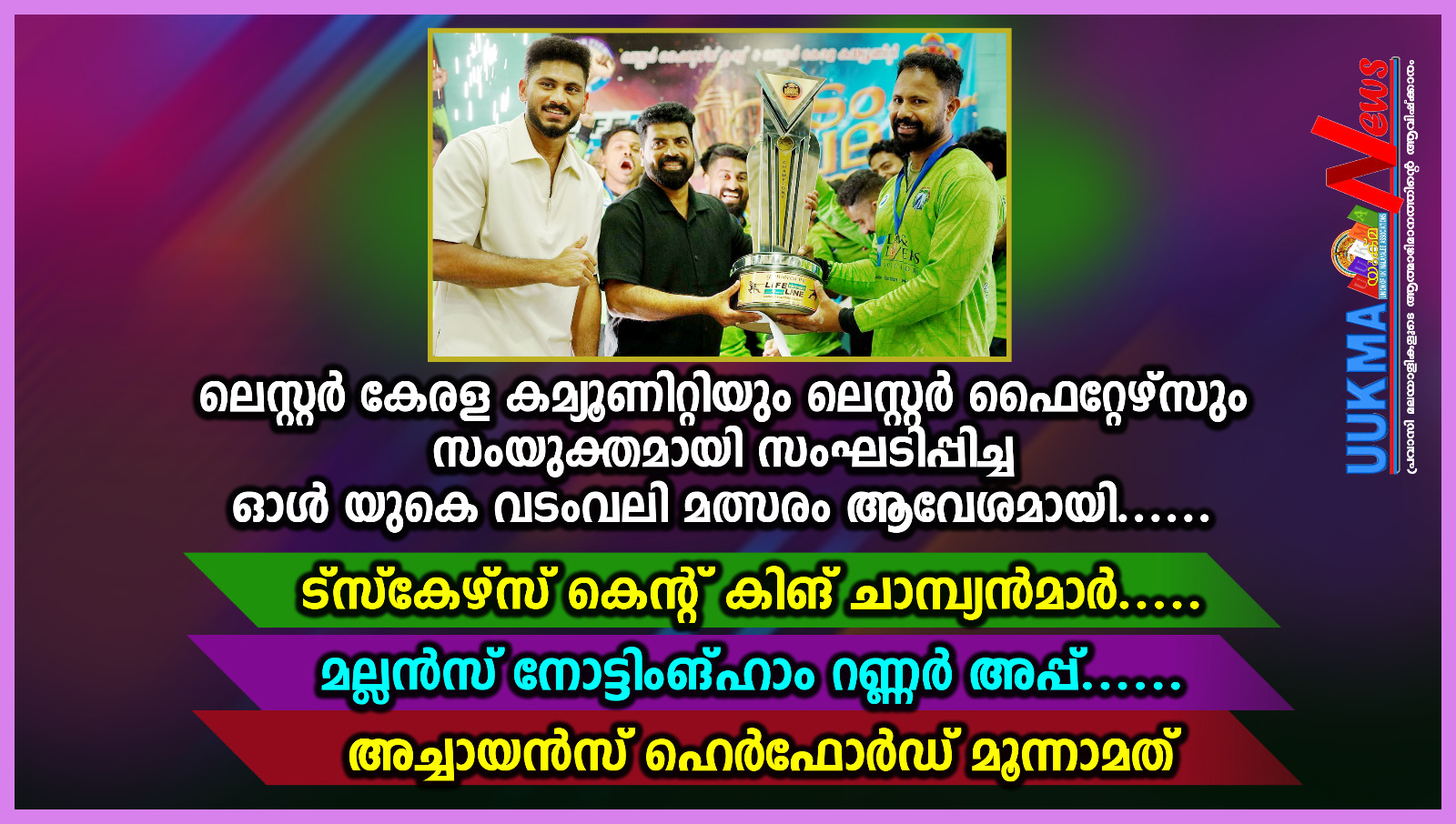 ലെസ്റ്റർ കേരള കമ്മ്യൂണിറ്റിയും ലെസ്റ്റർ ഫൈറ്റേഴ്സും സംയുക്തമായി ജൂലൈ 19തിന് സംഘടിപ്പിച്ച പ്രഥമ ഓൾ യുകെ വടംവലി മത്സരം വൻ വിജയത്തോടെ സമാപിച്ചു. ജഡ്ജ്മീഡോ സ്കൂളിൽ നടന്ന ആവേശകരമായ പോരാട്ടത്തിൽ 18 ടീമുകൾ മാറ്റുരച്ചു. ഫൈനലിൽ ട്സ്കേഴ്‌സ് കെൻ്റ് കിങ്സ് ചാമ്പ്യൻ പട്ടം സ്വന്തമാക്കി.