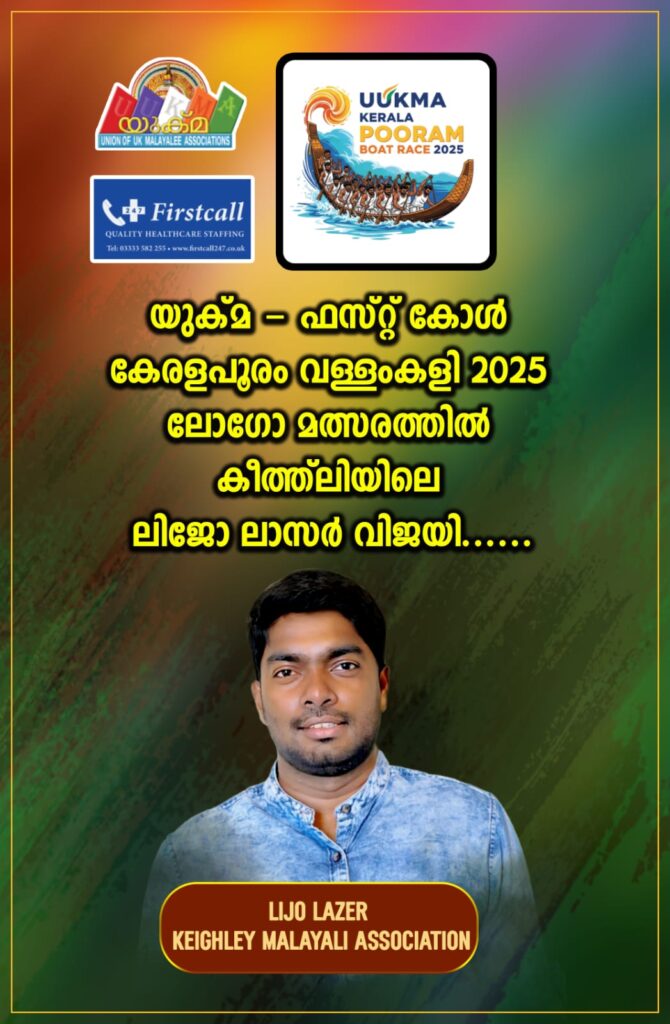 യുക്മ – ഫസ്റ്റ് കോൾ കേരളപൂരം വള്ളംകളി 2025 ലോഗോ മത്സരത്തിൽ വെസ്റ്റ് യോർക്ക്ഷയർ കീത്ത്ലി മലയാളി അസ്സോസ്സിയേഷനിൽ നിന്നുള്ള ലിജോ ലാസർ വിജയിയായി. ആഗസ്റ്റ് 30 ശനിയാഴ്ച നടക്കുന്ന ഏഴാമത് യുക്മ കേരളപൂരം വള്ളംകളി മത്സരത്തിൻ്റെ മുഴുവൻ ഔദ്യോഗിക കാര്യങ്ങൾക്കും ലിജോ ഡിസൈൻ ചെയ്ത ലോഗോയായിരിക്കും ഉപയോഗിക്കുക.