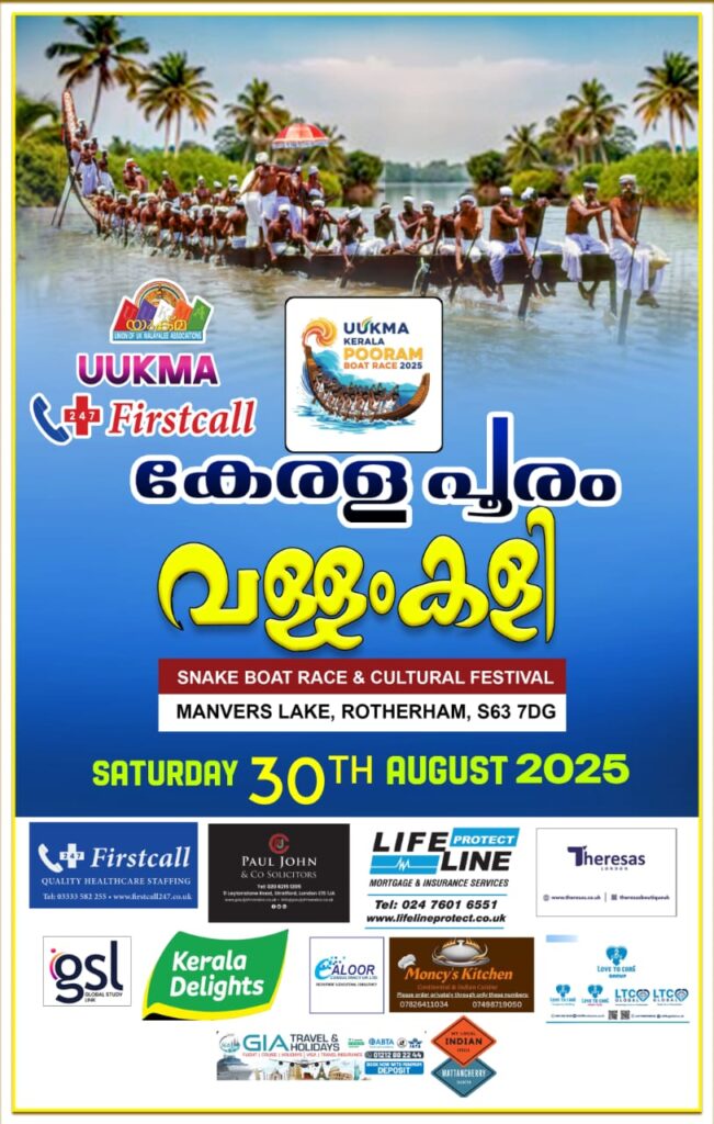കായികപ്രേമികളുടെ ആവേശമായ വള്ളംകളിയും മലയാളികളുടെ പ്രിയപ്പെട്ട കലാരൂപങ്ങളായ തിരുവാതിരയും തെയ്യവും പുലികളിയും നൃത്ത നൃത്യങ്ങളും സംഗീതവും ആസ്വദിക്കുവാൻ മുഴുവൻ യുകെ മലയാളികളെയും യുക്മ ദേശീയ സമിതി, ആഗസ്റ്റ് 30 ന് റോഥർഹാം മാൻവേഴ്സ് തടാകക്കരയിലേക്ക് സ്വാഗതം ചെയ്യുന്നു.