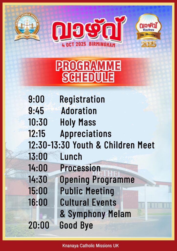ഒൿടോബർ 4 യു.കെ. യിലെ ക്നാനായ സമൂഹത്തിന് ദൈവാനുഗ്രഹത്തിന്റെ ദിനം കൂടിയാണ്. വാഴ്വ് എന്ന പേരിനെ അന്വര്ത്ഥമാക്കും വിധം പരി. കുര്ബാനയുടെ ആരാധനയോടെയും, ആശീര്വാദത്തോടെയും രാവിലെ 9:45 ന് പരിപാടികള് ആരംഭിക്കും. 10.30 ന് അഭി. മാര് ജോസഫ് പണ്ടാരശേരീൽ പിതാവിന്റെ മുഖ്യ കാര്മ്മികത്വത്തില്, യു.കെ. യിലെ ക്നാനായ വൈദികരുടെ സഹകാര്മ്മികത്വത്തില്, പൊന്തിഫിക്കല് കുര്ബാന അര്പ്പിക്കപ്പെടുന്നു. ഉച്ചഭക്ഷണത്തെ തുടര്ന്ന് പൊതുസമ്മേളനം എന്നിവയ്ക്ക് ശേഷം യു.കെ. യിലെ എല്ലാ മിഷനുകളില്നിന്നുമുള്ള കലാപ്രതിഭകളുടെ മികവുറ്റ പരിപാടികൾ, ക്നാനായ സിംഫണിമേളം എന്നിവ വേദിയിൽ അരങ്ങേറും രാത്രി 8:00 മണിയോടെ പരിപാടികള്ക്ക് തിരശ്ശീല വീഴും തങ്ങളുടെ വിശ്വാസപ്രഘോഷണദിനമായും, ക്നാനായ പൈതൃക പാരമ്പര്യങ്ങളുടെ ഉണര്ത്തുപാട്ടായും, സൗഹൃദസംഗമ കൂട്ടായ്മ വേദിയായും മാറുന്ന ഒക്ടോബർ 4 ലെ വാഴ്വ് – 25-നെ യു.കെ. യിലെ ക്നാനായ ജനത തികഞ്ഞ പ്രതീക്ഷയോടെയാണ് കാത്തിരിക്കുന്നത്.