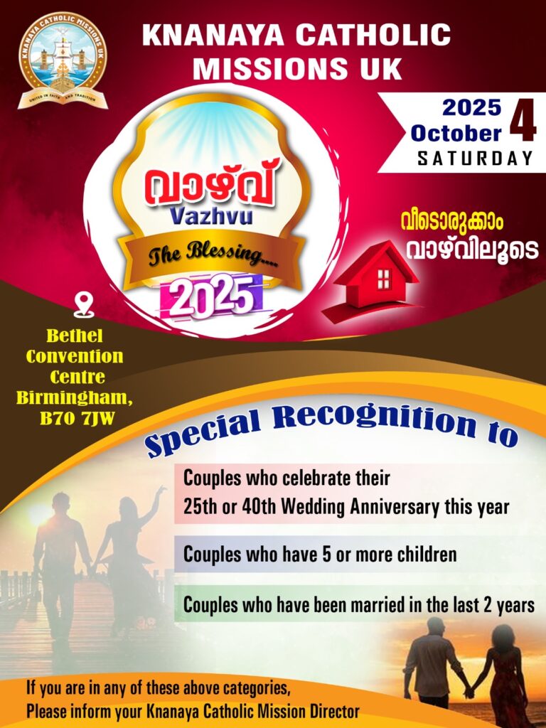 യു.കെ.യിലെ ക്നാനായ കത്തോലിക്കര്ക്ക് വേണ്ടി മാത്രമായി സ്ഥാപിതമായ 15 ക്നാനായ മിഷനുകളുടെ നേതൃത്വത്തില് 2025 ഒക്ടോബർ 4 ന് നടത്തപ്പെടുന്ന മൂന്നാമത് ക്നാനായ കുടുംബ സംഗമത്തിന് വാഴ്വ് -25 ഒരുക്കങ്ങള് പൂര്ത്തിയായി.