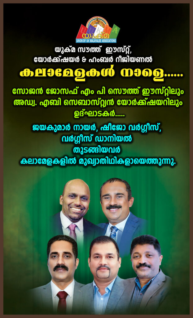 യുക്മയിലെ പ്രമുഖ റീജിയനുകളായ സൌത്ത് ഈസ്റ്റ്, യോർക്ക്ഷയർ & ഹംബർ റീജിയണൽ കലാമേളകൾ നാളെ (ഒക്ടോബർ 04 ശനിയാഴ്ച) അരങ്ങേറുകയാണ്. യുക്മ – കാർഗോ ഫോഴ്സ് സൌത്ത് ഈസ്റ്റ് റീജിയണൽ കലാമേള റെഡ്ഹില്ലിലും യോർക്ക്ഷയർ & ഹംബർ റീജിയണൽ കലാമേള ഷെഫീൽഡിലുമാണ് നടക്കുന്നത്.