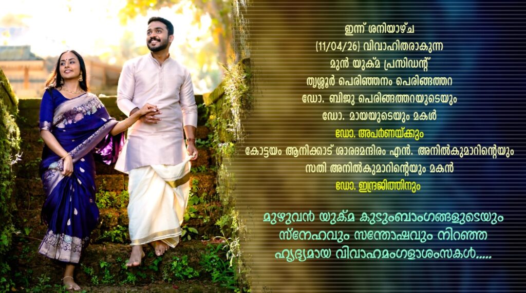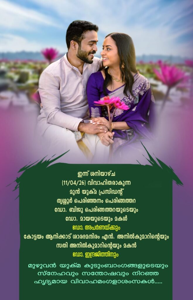 ഇന്ന് വിവാഹിതരാകുന്ന ഡോ. അപർണയ്ക്കും ഡോ. ഇന്ദ്രജിത്തിനും യുക്മ കുടുംബത്തിൻ്റെ ആശംസകൾ……