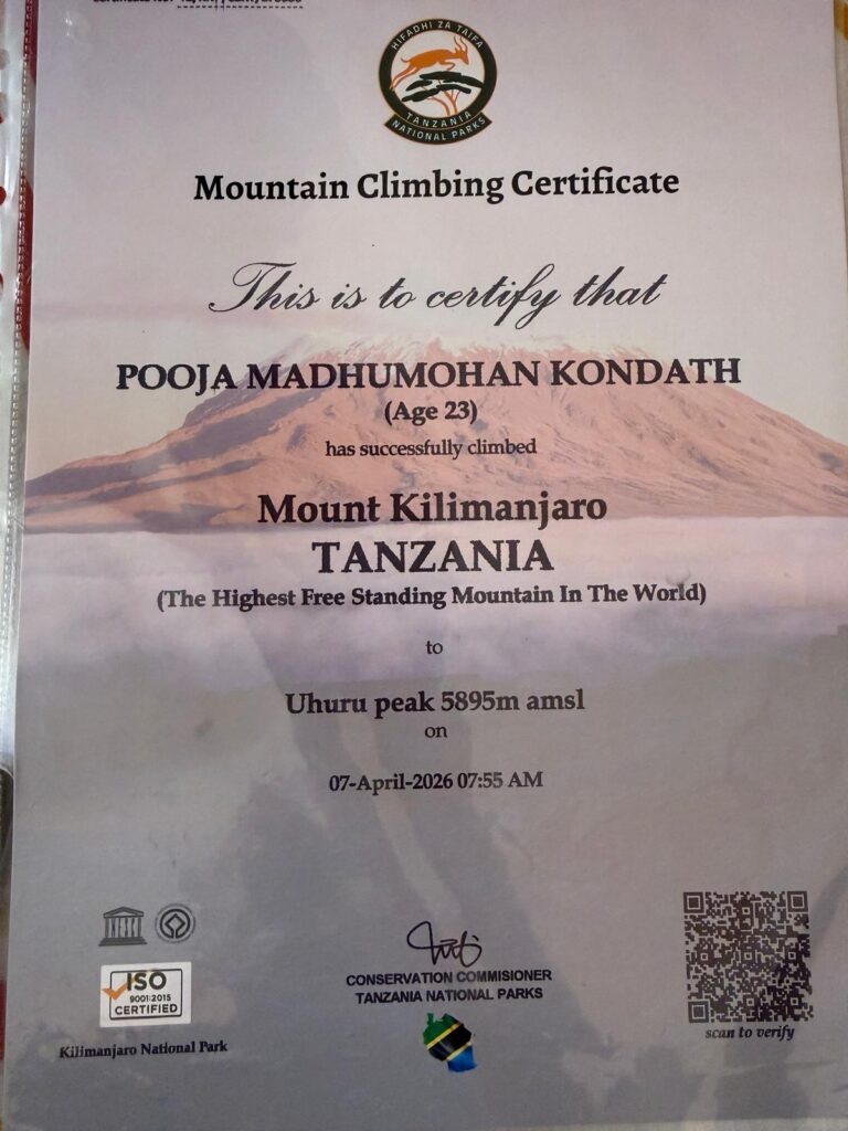 കിളിമഞ്ചാരോ കീഴടക്കി യുകെ മെഡിക്കൽ വിദ്യാർത്ഥിനിയായ പൂജ, ഒപ്പം റിനീഷും മാക്സിയും; ഇനിയും വലിയ ലക്ഷ്യങ്ങള്‍