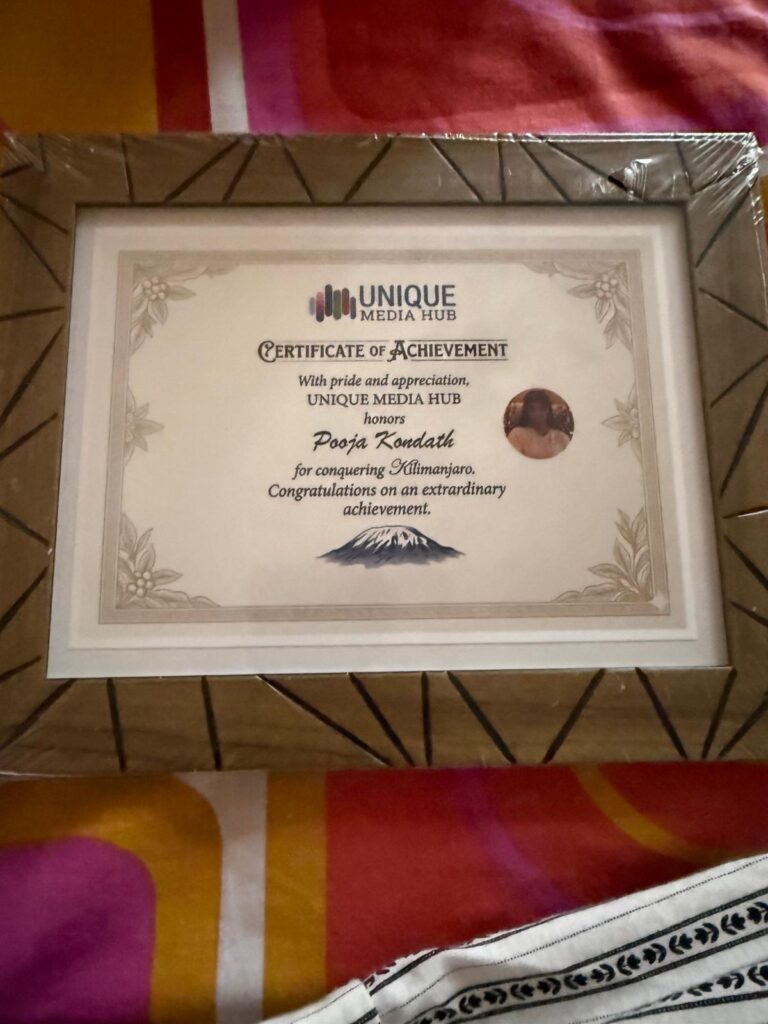 ടാന്‍സാനിയയിലെ കിളിമഞ്ചാരോയാണ് ആഫ്രിക്കന്‍ വന്‍കരയിലെ ഏറ്റവും ഉയരം കൂടിയ കൊടുമുടി. അങ്ങനെയാണ് കിളിമഞ്ചാരോ ലക്ഷ്യം വെച്ചതെന്ന് പൂജ പറയുന്നു. ഏപ്രിൽ ഒന്നിന് കിളിമഞ്ചാരോ എയർപോർട്ടിലെത്തിയ സംഘം ഏപ്രിൽ രണ്ടിനാണ് കൊടുമുടിയുടെ ഏറ്റവും ഉയരംകൂടിയ ലക്ഷ്യസ്ഥാനത്തേക്കുള്ള യാത്ര ആരംഭിക്കുന്നത്. മണിക്കൂറോളം വലിയ പ്രശ്നങ്ങളൊന്നുമില്ലാതെ മുകളിലേക്ക് കയറി. ആള്‍റ്റിറ്റ്യൂഡ് സിക്നെസിന്റെ പ്രശ്നങ്ങളൊന്നും എനിക്കുണ്ടായിരുന്നില്ല. എന്നാല്‍ മുന്നോട്ട് പോകുന്തോറും ഊർജ്ജം ഇല്ലാതെയാകുന്നത് പോലെ തോന്നി. അതായത് പെട്ടെന്ന്, പെട്ടെന്ന് ക്ഷീണിതയായി. ഓരോ അടിയും മുന്നോട്ട് വെക്കാന്‍ ഏറെ പ്രയാസപ്പെട്ടു. ആ സമയത്ത് കൂടെയുള്ളവർ നൽകിയ പ്രോത്സാഹനവും ബലവുമാണ് മുന്നോട്ട് നയിച്ചത്.