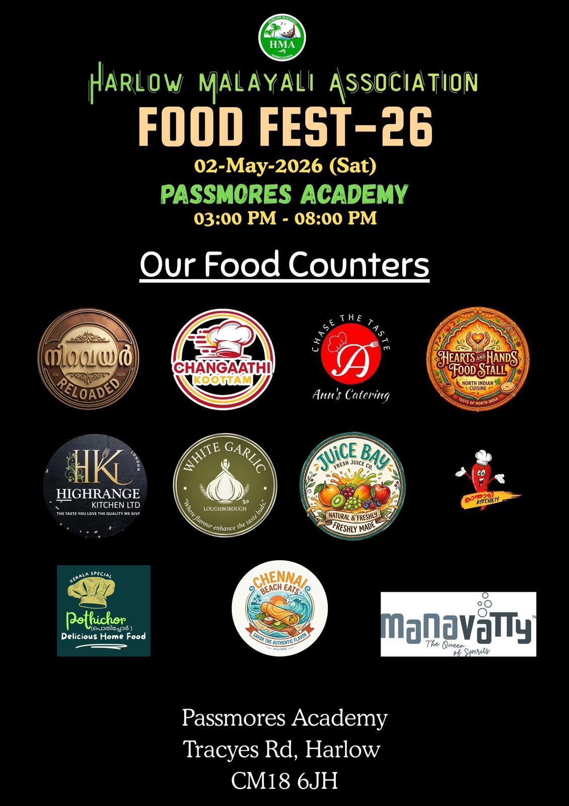 രുചി വൈവിധ്യങ്ങളുടെ മേള പെരുമ;  ഹാർലോ മലയാളി അസോസിയേഷന്റെ ഫുഡ് ഫെസ്റ്റിവൽ  ഹാർലോയിലെ പാസ്മോർ അക്കാദമിയിൽ  മെയ് 2 ന്.