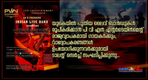 യുകെയിൽ വിവിധ റീജിയണുകളിൽ പുതിയ ലൈവ് ബാൻഡുകൾ രൂപീകരിക്കാൻ പി വി എൻ എൻ്റർടെയിൻമെൻ്റ് രാജ്യവ്യാപകമായി ഗായകർക്കും, വാദ്യോപകരണങ്ങളിൽ പ്രാഗത്ഭ്യം തെളിയിച്ച പ്രതിഭകൾക്കുമായി ടാലൻ്റ് സെർച്ച് സംഘടിപ്പിക്കുന്നു……